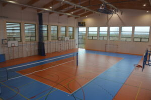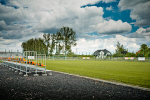 3 szatnie z pełnym węzłem sanitarnym, oświetlenie, parking i trybuny dla kibiców.